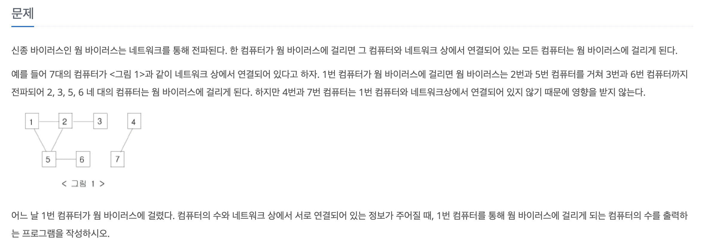 그래프가 주어졌고 "1번 컴퓨터가 감염되어서 2,3,5,6 컴퓨터도 감염된다."를 언급한 것으로 보아 그래프 탐색 유형임을 눈치챘다.