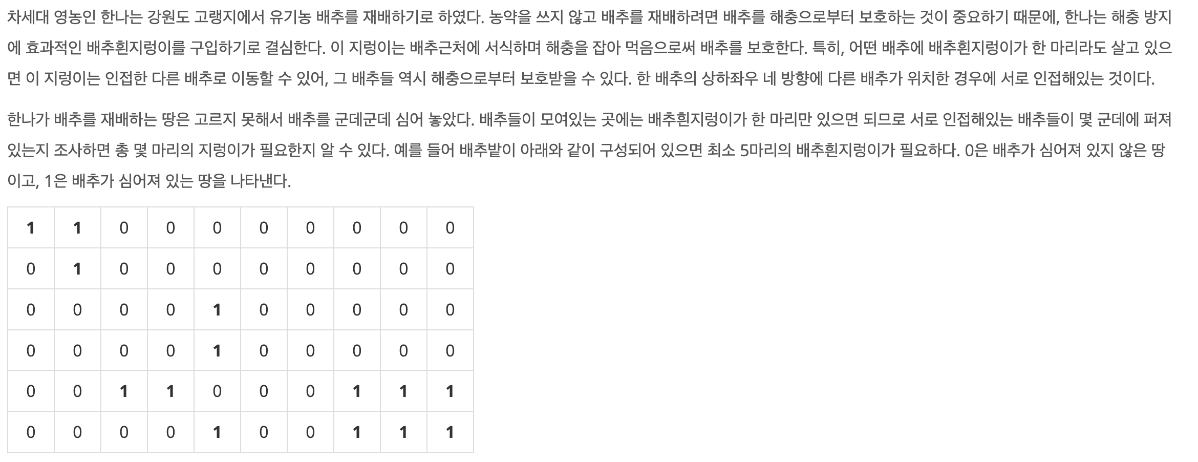 - 1은 배추가 심어진 땅, 0은 배추가 없는 땅이다.