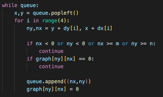 처음에는 for 안에서 방문 처리하지 않고 for 밖에서 queue.popleft 한 순간 어든 x, y를 이용해서 그 다음 라인에 x,y를 방문 처리를 했다. 이렇게 하면 문제의 답은 맞으나 시간 초과, 메모리 초과 에러가 발생한다. 그 이유는 queue에 append 하자마자 그 지점을 방문 처리 하지 않았기 때문이다. queue에 넣자 마자 방문 처리 하면, 그 지점은 다시 방문할 수 없을 거라고 생각했으나 이는 완전 잘못된 생각이다.