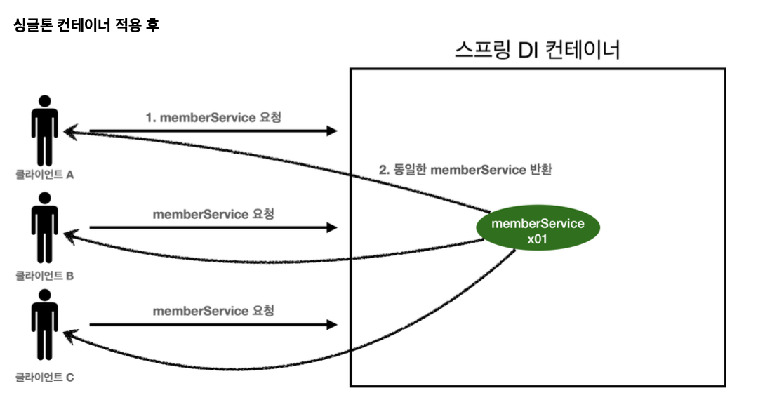 웹 애플리케이션은 보통 여러 고객이 동시에 요청을 한다. 순수 DI 컨테이너일 경우에는 고객이 요청을 보낼때 마다 객체를 생성할 것이다. 이능 굉장한 메모리 낭비를 유발한다. 만약, 고객 트래픽이 초당 100이 나오면 초당 100개 객체가 생성되고 소멸된다. 이런 메모리 낭비 문제 때문에 고객의 요청이 동시에 발생할 경우에는 해당 객체를 딱 1개만 생성하고, 공유하도록 설계할 필요가 있다. 이것이 바로 싱글톤 패턴이다.