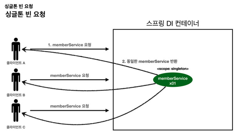 - 이후에 스프링 컨테이너에 같은 요청이 와도 같은 객체 인스턴스의 스프링 빈을 반환한다.
